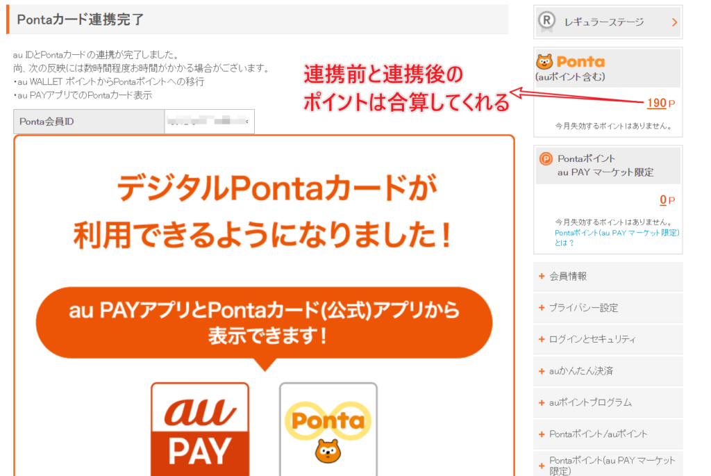修正完了後はスムーズにauIDとPontaカードの連携が完了
