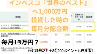 投資信託 松井証券でインベスコ「世界のベスト」を1,000万円分運用した時のポイント還元と毎月分配金額 毎月決算型の投資信託「世界のベスト」に投資している運用額が1,000万円の場合、毎月どれぐらいの分配金があるのか分かりますか?旧NISA枠で毎月受け取る分配金に非課税ですが、特定口座で運用した場合約20%の税金が引かれてしまいます。※新NI... 2025.08.17 投資信託